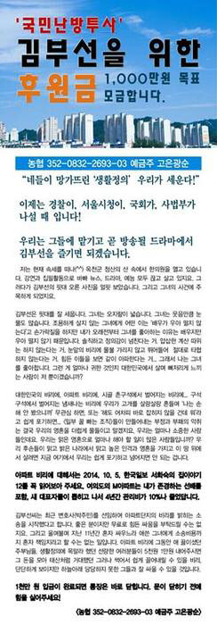 4일 오전 김부선씨는 사회관계망서비스(SNS)인 페이스북 계정을 통해 “난방비리를 밝히려다 손해를 보게 됐다. 5000명 (페이스북)친구들이 만원씩만 성원해달라”면서 모금에 사용하는 고은광순씨 명의의 농협 예금계좌를 공개했다. 김 씨는 또 “현재 (이 계좌로) 515만원이 입금됐다”면서 “만원씩 5000명이면 (5000만원에 이른다)”고 했다.