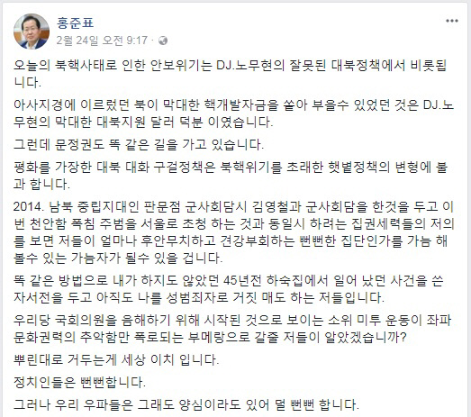 자유한국당 홍준표 대표는 지난달 24일 자신의 페이스북에 “미투 운동이 우리당 국회의원을 음해하기 위해 시작된 것으로 보인다”라며 “좌파 문화 권력의 추악함만 폭로되는 부메랑이 될 줄 저들이 알았겠냐”라고 적었다. 그러면서 홍 대표는 “내가 하지도 않았던 45년 전 하숙집에서 일어났던 사건을 쓴 자서전을 두고 아직도 나를 성범죄자로 거짓 매도하고 있다”라고 주장했다. 홍 대표는 대학 시절 친구의 성범죄 모의에 ‘돼지발정제’를 구해줬다는 일화를 자서전에 적은 것이 드러나 비판을 받은 바 있다.