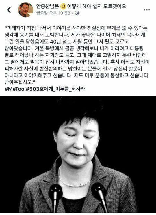 안중찬 출판기획자 페이스북 화면 갈무리더불어민주당의 당명 제안자로 알려져 있는 출판기획자 안중찬씨도 지난달 26일 자신의 페이스북에 박근혜 전 대통령의 사진과 함께 “제가 꽃다운 나이에 최태민 목사에게 그런 일을 당했음에도 40년 넘는 세월 동안 그저 뭣도 모르고 참아왔다. 그때 제대로 고발하지 못한 바람에 그 딸에게도 발목이 잡혀 나라까지 말아먹었다. 저도 미투 운동에 동참하고 싶다”라는 글을 올렸다. 글 밑에는 ‘503호에게 미투를 허하라’라는 해시태그도 달았다. 피해자의 고통을 ‘박근혜 패러디’로 이용했다는 비판이 이어지자 안씨는 글을 삭제하고 2일 “제가 미투 운동을 조롱하고 여성을 비하하는 주요한 인물로 비친 점을 부끄럽게 생각하고 변명하지 않겠다”라며 사과문을 올렸다.