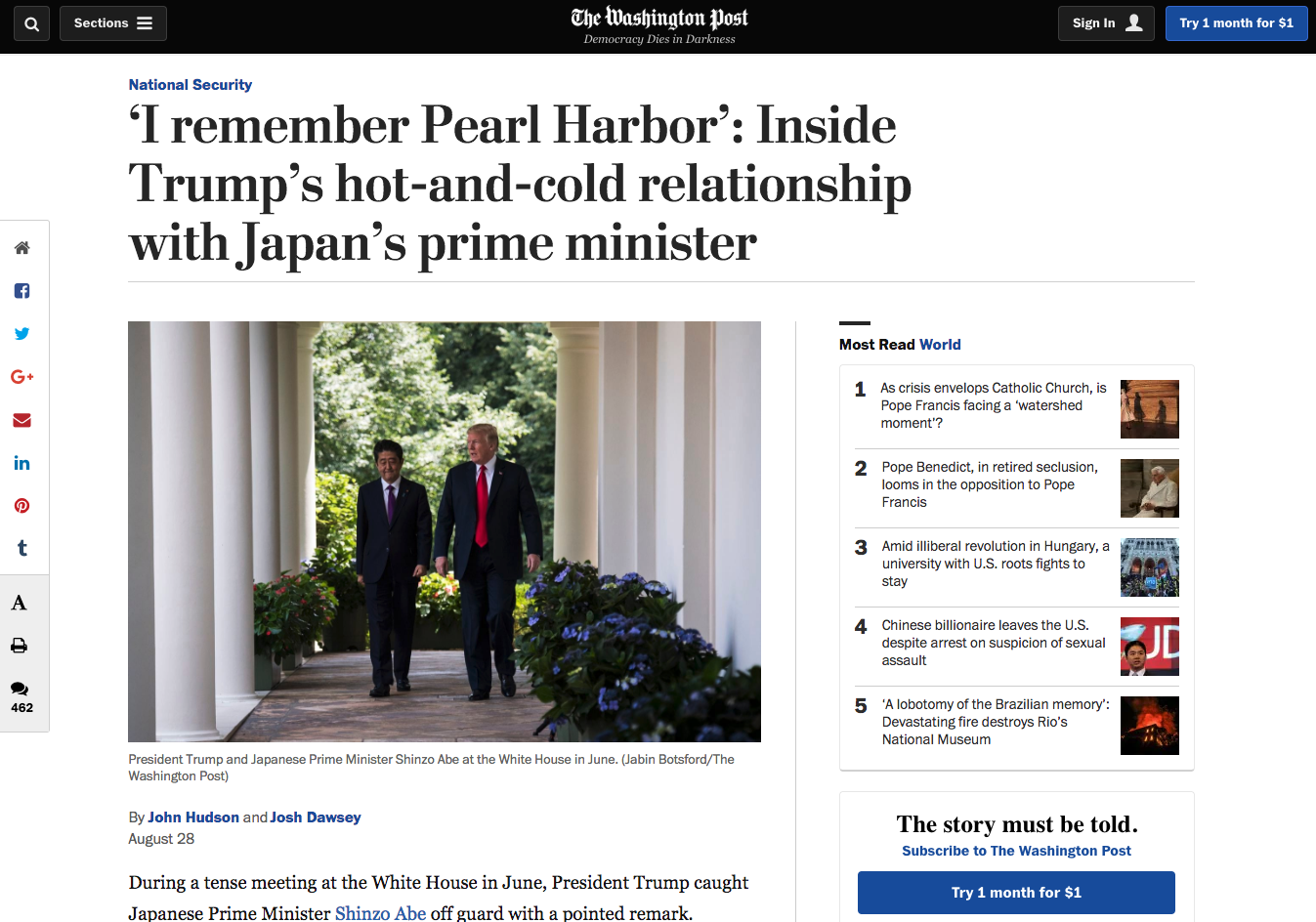 But that Post story was highly unusual in the way that it praised Abe. It included details about Abe's relationship with Trump that could only come from access to high-level Japanese officials. The story led with an anecdote from June, when Trump reportedly told Abe in a "tense" meeting that "I remember Pearl Harbor," leaving Abe "exasperated." Also noteworthy was the long string of sympathetic tweets from national security reporter John Hudson, painting Abe as a lone voice for reason with North Korea.