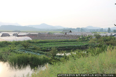 만경대협동농장의 농가를 둘러본 후 넓은 벌판을 한눈으로 바라볼 수 있는 곳으로 차를 타고 이동하였다. 도로 한 켠에 차를 세우고 내려서 보니 탁 트인 들판은 웬만큼 평지여서 논으로 이용할 수도 있을 것 같은데 이 일대는 대부분 채소를 가꾸는 남새농장이다. 저멀리 1km 쯤 너머에 보이는 지역은 만경대협동농장 경계를 벗어난 다른 협동농장이라고 한다. 만경대 협동농장은 남새농장으로 125정보, 과수용으로 33정보, 그리고 논벼로 200정보의 토지를 이용하고 있다고 한다. 김태현 생활구현농장과 협동농장에 관한 여러 가지 부문을 대화하며 알아보았다.