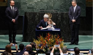FacebookTwitterPinterest Kerry signs the Paris climate agreement with his granddaughter. Photograph: Xinhua/Rex/Shutterstock
