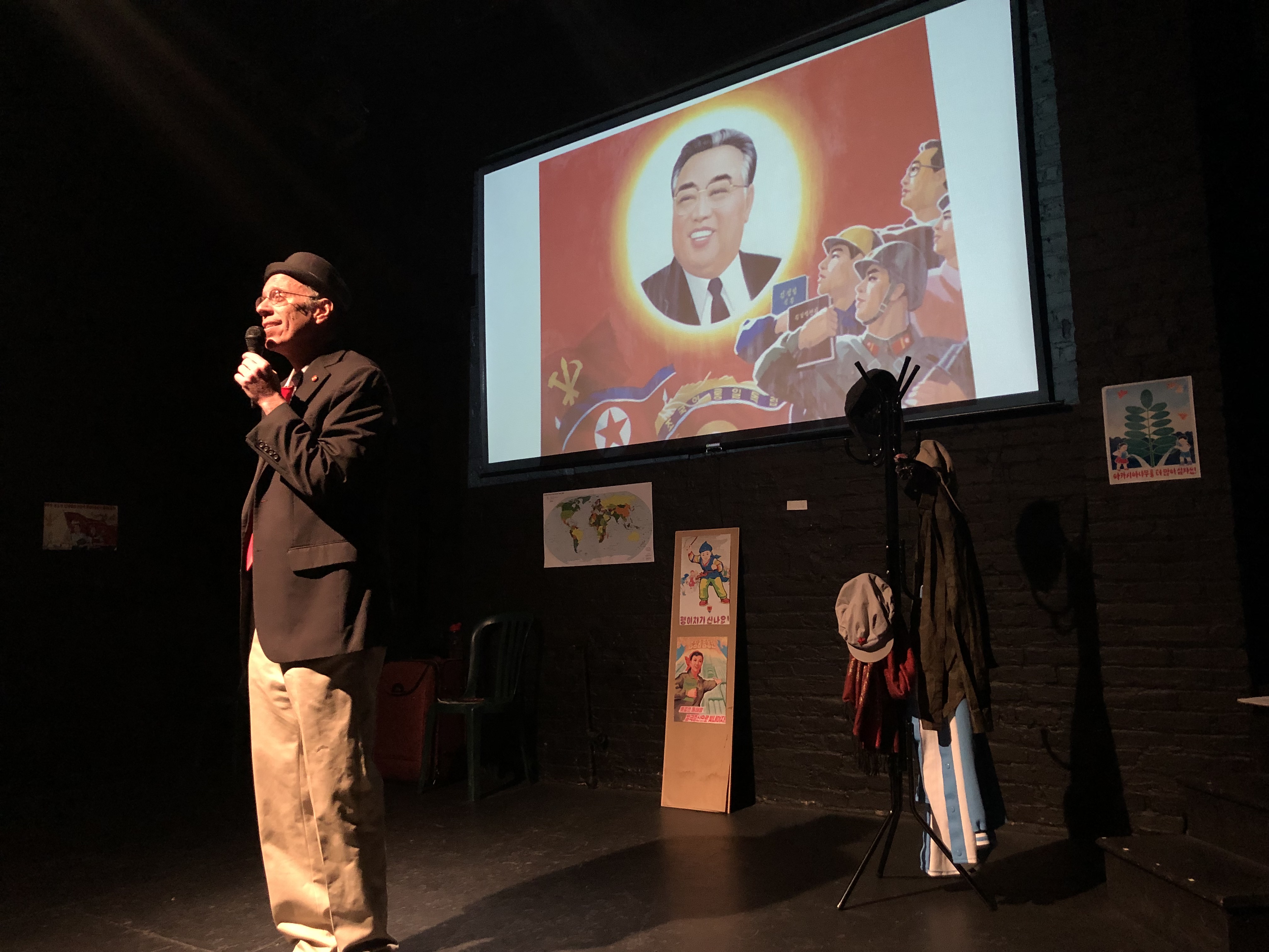 John Feffer plays the part of his minder doing karaoke in his new play, Next Stop: North Korea on March 9, 2019. (Tim Shorrock)