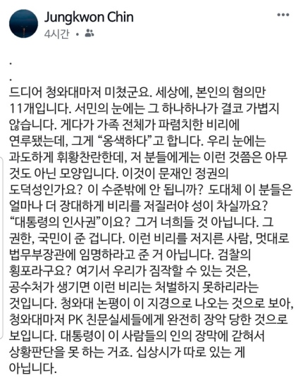 진 전 교수는 이날 자신의 페이스북에 올린 글에서 "본인 혐의만 11개다. 서민의 눈에는 그 하나하나가 결코 가볍지 않다"며 "게다가 가족 전체가 파렴치한 비리에 연루됐는데, 그게 ‘옹색하다’고 한다"라고 했다. 이어 "우리 눈에는 과도하게 휘황찬란한데, 저분들에게는 이런 것쯤은 아무 것도 아닌 모양"이라며 "이것이 문재인 정권의 도덕성인가? 이 수준밖에 안되나? 도대체 이분들은 얼마나 더 장대하게 비리를 저질러야 성이 차실까"라고 했다.