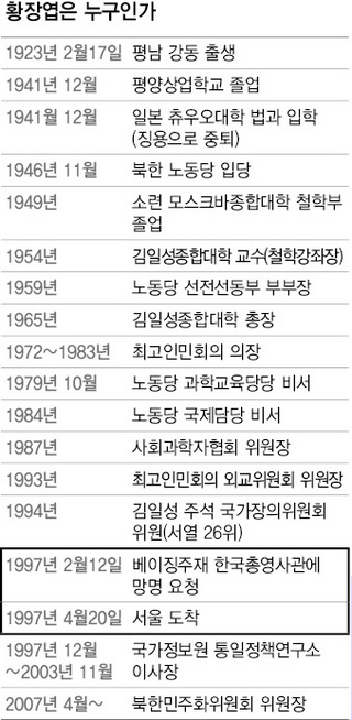 주체사상의 배후세력으로 남한 내에도 유명했던 황장엽이 97년 2월12일 탈북, 남한에 망명했다는 사실은 남북한 모두에 큰 사건이었다. 그가 김덕홍 전 북한 여광무역 사장과 함께 베이징 주재 한국 총영사관에 망명을 신청한 뒤 필리핀을 거쳐 서울에 도착하자, 남한 진보진영에는 소련 붕괴 이후 또 한 번의 '쓰나미'가 몰려왔다. 베일에 싸여 있던 북한 정권의 비사가 그의 입에서 쏟아졌다. 황장엽은 분단 이후 지금까지 최고위급 탈북자로 남아 있다. 그는 북한 사정을 가장 잘 알기에, 가장 무섭게 북한의 치부를 공격할 수 있는 인물로 통했다.
