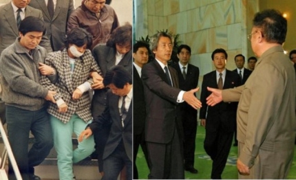 1987년 북한의 사주로 KAL기 폭파 범행후 체포돼 압송되는 김현희(좌)/2002년 평양에서 만난 고이즈미 총리와 김정일 위원장/사진=연합뉴스