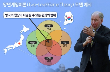 양면게임 이론`에서 레벨1은 국제정치 차원, 레벨2는 국내정치 차원의 협상을 의미하며, 양국간 협상 타결 가능성을 높이려면 양국의 윈셋(교차 합의 가능영역)의 범위를 넓혀야 한다미국 하버드대의 로버트 퍼트넘 교수가 제시한 '양면게임 이론'은 국가 간 협상과정을 설명하는 데 흔히 사용됩니다. 양면게임 이론에 따르면 국가 간 협상이 타결되려면 양국 정부는 협상 테이블 맞은편의 상대국뿐 아니라 테이블 바깥에서 자국 내 여러 행위자들 사이 이익조정과 승인을 필요로 합니다. 이들은 국회뿐 아니라 국민, 시민단체 등을 아우르는데, 과거사 문제에 대해 한일 양국 대표가 합의했다 해도 여론이 결사반대 한다면 협상은 실패하게 되는 이치죠. 때문에 외교협상에 나선 정부는 상대 정부뿐 아니라 여론의 승인을 받는 것이 중요해집니다.