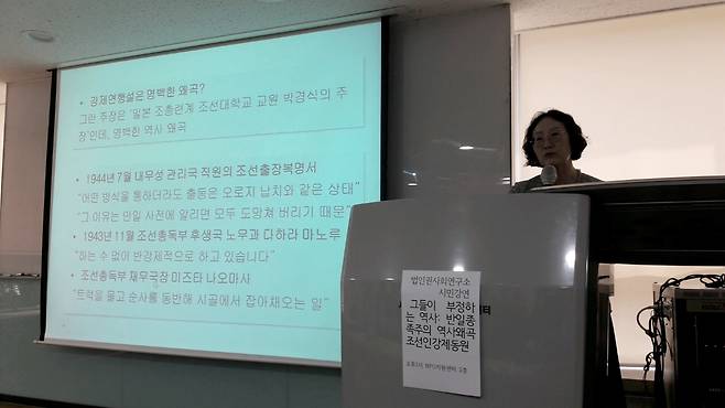 정혜경 박사가 21일 서울 중구 서울시NPO지원센터에서 ‘그들이 부정하는 역사 : 조선인 강제동원’이라는 제목의 강연을 하고 있다.