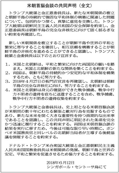朝鮮戦争の終結について直接的な言及はないものの「米朝間の数十年にわたる緊張と敵対行為を克服し、新たな未来を開く」ための会談であることを強調し、北朝鮮の体制を保障したうえで国交正常化に向けて対話交渉をさらに進めていくことを確認している。米国内強硬派や日本政府が対話の条件とした「非核化」については、CVIDなどの具体的な検証方法や時期には触れず、北朝鮮が「努力することを約束する」としており、交渉推移を見据えて段階的に進めていく内容の合意となった。