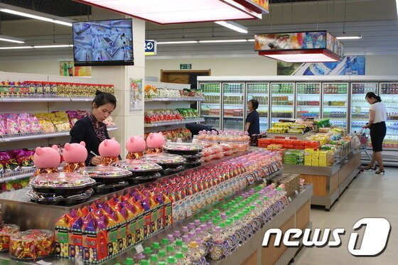 | 2019년 새로 단장해 문을 연 대성백화점 1층 슈퍼마켓에서 평양시민들이 물건을 고르고 있다. (사진 제공: 평화경제연구소)© 뉴스1 |