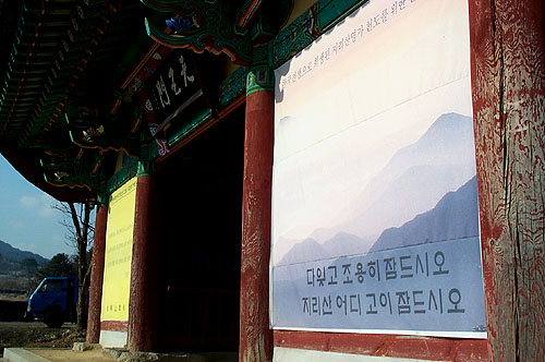 절집을 들어서는 천왕문(天王門) 왼켠에는 `인류의 빛 예수 그리스도 오신 날, 다함께 기뻐합니다. - 지리산 실상사`라는 현수막이, 오른켠에는 `한국전쟁으로 희생된 지리산영가 천도를 위한 천일기도 - 다잊고 조용히 잠드시오, 지리산 어디 고이 잠드시오`라는 현수막이 손님을 맞았다.