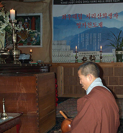 네시 반 어김없이 도법스님이 보광전(普光殿)에 정좌하자 새벽예불이 시작되고 새벽예불을 마친 이들이 하나둘 자리를 정리하고 일어서자 300일째를 넘어선 도법스님의 천일기도가 시작되었다.