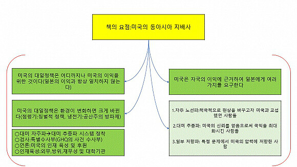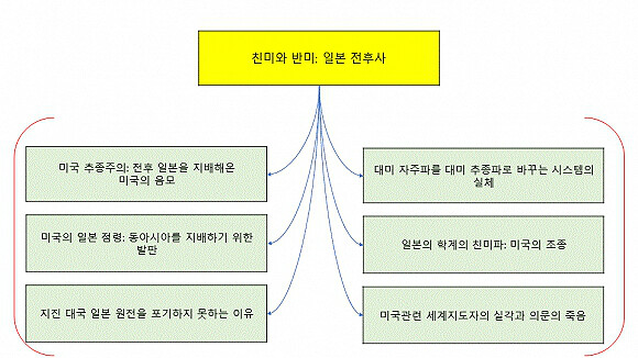 이 책은 1945년 패전 후의 현대 일본사를 미국에 대한 자주파와 친미파 간의 대립, 갈등, 대결 구도로 해석했다. 미국이 일본 내 친미파를 육성, 지원해 정ㆍ재ㆍ학 관계에서 헤게모니를 잡도록 했다는 것이 이 책의 핵심이다.