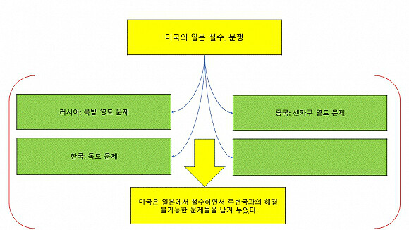 미국은 일본에서 철수하면서 주변국과의 해결 불가능한 문제들을 남겨두었다. 러시아와는 북방영토 문제, 한국과는 독도 문제, 중국과는 센카쿠 열도 문제가 그것이다.--- p.187
