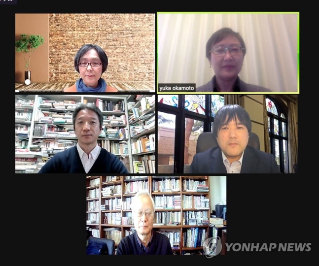 일본 학계·시민사회의 램지어 비판 성명 발표 현장지난해 3월 램지어 교수의 논문을 비판한 일본 시민단체 '파이트 포 저스티스'(Fight for Justice)의 온라인 기자회견에 참석한 요시미 요시아키 일본 주오대 명예교수(가장 밑)와 이타가키 류타 도시샤대 교수(왼쪽 가운데) [파이트 포 저스티스 제공.연합뉴스 자료사진]