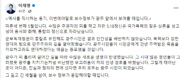 이 대표는 "길고 긴 세월을 넘어, 보수 정부가 응답해야할 때"라며 "43년의 세월 동안 수많은 기회가 있었지만 보수 정부는 '학살의 후예'임을 입증하듯 끝내 '5·18 부정 DNA'를 극복하지 못했다"고 지적했다.