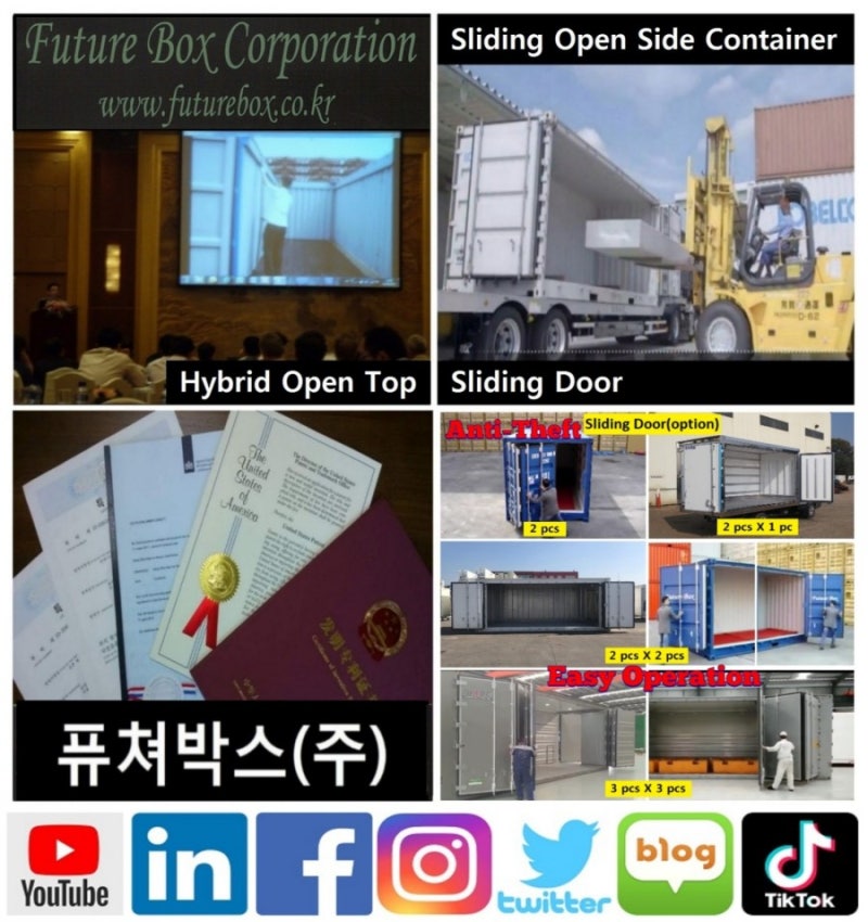Sliding Door, Sliding Open Side, Open Top, Hanger 컨테이너등의 특허 보유. 컨테이너와 운송 장비등을 국내외 해운, 물류, 철도, 리스회사등에 공급. 유럽, 미국, 중국, 일본등에 에이전트와 협력업체와 보유. e-mail: futurebox@futurebox.co.kr TEL: (02)3421-8534 FAX: (02)3422-0762