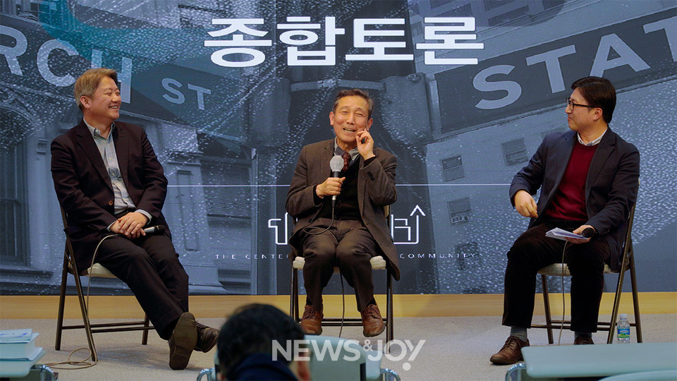 도시공동체연구소가 김상봉 교수(가운데)를 초청해 '영성의 정치, 정치의 영성'이라는 주제로 컨퍼런스를 개최했다. 뉴스앤조이 안디도[뉴스앤조이-안디도 기자] 도시공동체연구소가 '영성의 정치, 정치의 영성'이라는 주제로 제5회 교회와 공동선 컨퍼런스(CCG·Church for the Common Good conference)를 열고 비상계엄 이후 극우 개신교 세력이 준동하고 있는 상황에서 기독교 영성이 어떻게 공동선에 이바지할 수 있을지 고민했다. 2월 17일 연동교회에서 진행한 이번 컨퍼런스에는 시민 40여 명이 참석했다.