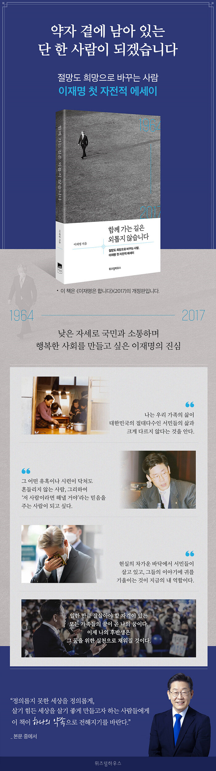 정치인 이재명의 첫 자전적 에세이로 2017년에 출간된 《이재명은 합니다》의 개정판이다. 가난한 어린 시절 공장에서 일하며 장애를 입고 자살까지 시도했던 굴곡진 삶, 인권변호사가 되어 시민운동에 가담했던 일, 정책을 수행하며 겪은 위기의 순간들, 한국 정치에 대한 생각과 철학 등 자신만의 목소리로 고난과 고민, 극복의 시간들을 담담하게 풀어냈다.