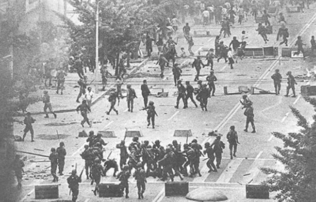 1980년 5·18민주화운동 때 광주 금남로에서 군인들이 시민들에게 폭력을 휘두르고 있다. 5·18기념재단 제공기타지마 명예교수는 “공포심을 넘어서는, 군대의 힘과 같은 정도의 깨끗하고 생생한 ‘무엇’의 존재에 대한 ‘자각’이 그에게서 생겨났다”며 “이러한 체험은 종교적 체험에 가까운 것으로, 이는 19세기 중엽 고뇌하던 최제우에게 ‘하늘님’이 말을 걸었던 상황과 유사하다”고 분석했다. 그리고 “신과의 일체화로 주체화된 대학생은 ‘더는 두렵지 않다는 느낌’을 갖게 됐고, ‘감히 내가 그것의 일부가 되었다’는 타자와의 일체성을 갖는다”고 강조했다.