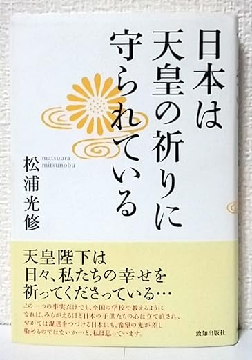 마츠우라 미츠노부(松浦光修)가 저술한 <일본은 천황의 기도에 의해 지켜지고 있다>는 2013년 8월 10일에 출간된 도서입니다. 저자는 이세 신궁(伊勢神宮) 바로 옆에 위치한 고가쿠칸 대학(皇學館大学)에서 교편을 잡고 있으며, 책이 출간된 시기가 20년마다 신사를 새로 짓고 신체를 옮기는 '시키넨 센구(式年遷宮)'로 이세 마을이 들끓던 때였음을 고려하여, '헌정(捧げもの)'의 의미로 이 책을 저술했다고 밝히고 있습니다. 이 책은 일본의 역사와 정체성의 핵심이라고 할 수 있는 '천황의 기도'와 '신대(神代) 이야기'의 중요성을 강조하며, 전후(戦後) 교육으로 인해 잊혀져 가는 일본인 본래의 마음을 되찾고자 하는 목적으로 쓰였습니다.