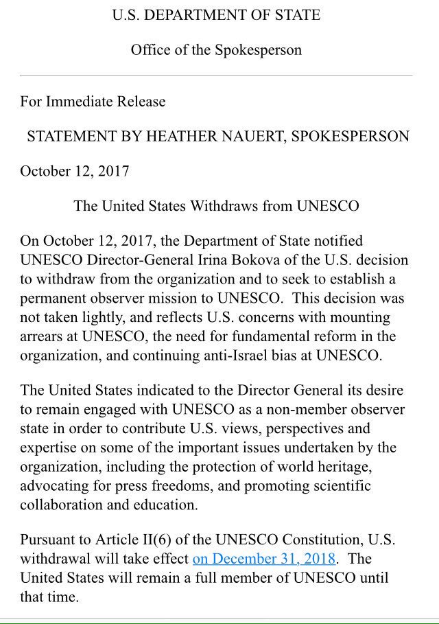 I welcome @realDonaldTrump's decision to withdraw from UNESCO.