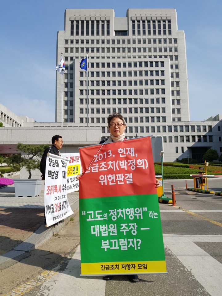 [한의신문=윤영혜 기자]지난달 28일 서울 교대역 대법원 앞에서는 1인 시위가 있었다. ‘고도의 정치행위라는 대법원 주장, 부끄럽지?’라는 현수막을 목에 건 이는 한의사인 고은광순 씨다. 2013년 헌법재판소가 긴급조치에 대해 위헌 판결을 내렸는데도 대법원이 국가를 상대로 피해자들이 낸 손해배상 소송에서 “대통령의 긴급조치권 행사는 고도의 정치성을 띤 국가행위로서 국민 개개인에 대해 민사상 불법행위를 구성한다고 볼 수 없다”는 판결을 내린 데 대한 저항이었다.