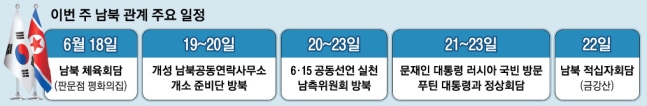 통일부, 개성공업지구지원재단, 현대아산 등 17명은 19일과 20일 출퇴근 방식으로 방북한다. 개성 남북공동연락사무소의 임시 사무소를 이달 중 열기 위한 준비 차원이다. 6·15 공동선언 실천 남측위원회는 20일부터 3박 4일간 평양에서 민족공동행사 및 민간교류 방안 등을 논의할 계획이다. ‘동해선·경의선 철도·도로 연결’과 ‘산림협력’을 위한 분과회의는 다음주에 열릴 전망이다.