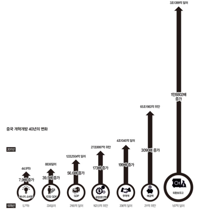 개혁개방 40년, 중국의 경제 성과는 가히 기적적이다. 1978년에서 지난해까지 39년 새 1인당 GDP는 39.5배가 늘었다. 국내총생산(GDP)은 56.6배로 늘었다. 공업생산액은 173배, 무역액은 무려 199배, 예금액은 3090배가 늘었다. 쯔푸(致富·부자가 됐다)라는 말이 과언이 아니다. 1978년 1억6700만 달러에 불과하던 외환보유고는 지난해 3조1399억 달러로 세계 1위다.