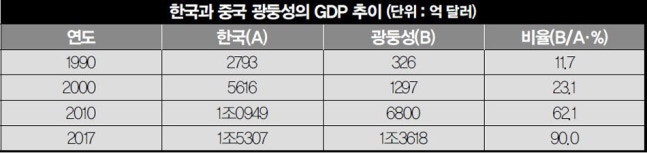 1990년대만 해도 광둥성의 GRDP는 한국의 10%대에 불과했다. 2000년 들어 20%대로 올라오더니 2010년대엔 50%를 넘어 지난해엔 한국의 90%까지 치고 올라왔다. 지난해 한국의 국내총생산(GDP)은 1조5307억 달러다. 한국의 올해 성장률 예상치는 2.9%(정부 발표 기준. 전문가 예상 2.8%)다. 광둥성의 올해 상반기 성장률은 10.45%였다. 예상 성장률 7%를 훨씬 뛰어넘는 수치다. 이대로 간다면 광둥성의 GRDP는 내년에 한국을 능히 추월할 것으로 예상된다.