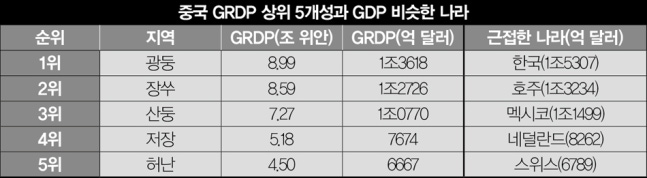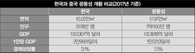 중국 학자들은 광둥성의 GRDP가 올해까지는 한국에 미치지 못하겠지만 내년엔 1조7533억 달러로 한국의 1조6975억 달러를 3%포인트 이상 따돌리고 추월할 것이라고 예상한다. 현재 광둥성과 한국의 경제성장 속도가 그대로 유지되고 환율 변화가 거의 없을 것으로 봤을 때다.