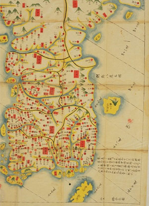 8) 풍신수길이 조선 침략에 대비해 만든 지도(팔도전도, 1592년이전)에도 대마도가 조선 땅이라고 표기되어 있다.