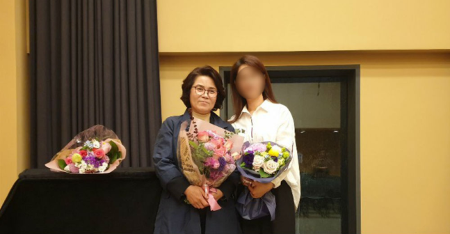 최근 북한인권정보센터 주최 행사에서 함께 탈북한 제자와 성악 공연을 한 뒤 사진 포즈를 취하는 허영희씨 ⓒ 허영희씨 제공