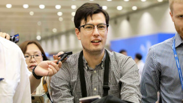 Australian student Alek Sigley arriving at the airport in Beijing after be was released from North Korea in July last year.CREDIT:AP