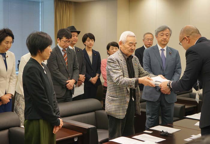 署名を手渡す田中宏・一橋大学名誉教授(中央)ら