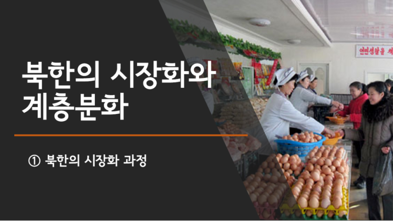 북한에서는 1990년대의 극심한 경제난인 고난의 행군 이후 본격적으로 시장이 주민의 대표적인 사적경제활동 공간으로 자리 잡기 시작하였습니다. 이는 국가의 배급제가 마비되면서 주민들이 시장을 통해서 직접 생계를 유지해야 했기 때문입니다. 나아가 시장의 활성화는 북한사회에 계층구조의 분화를 초래하게 되었습니다.