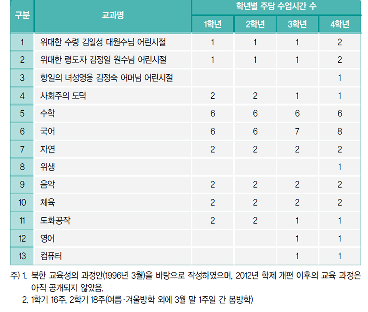 북한의 초등 교육기관인 소학교 재학 동안 학생들은 총 13개 과목을 교육받으며 교육 내용은 크게 정치사상, 과학 기술, 체육, 예능, 국방, 외국어 등 여섯 가지로 나뉩니다. 소학교의 수업은 보통 8시부터 시작하며 교육시간은 하루 평균 5시간으로 과목당 45분 수업에 10분 휴식을 원칙으로 하고 있어 우리와 크게 다르지 않지만 아래 북한의 소학교 교육과정 표를 보면 알 수 있듯 생소한 과목명이 몇몇 눈에 띕니다.