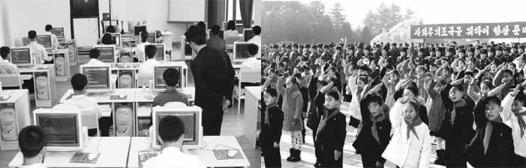 < 북한의 컴퓨터 교육 및 소년단 입단식, 사진출처 : 통일부 통일교육원 ‘2014 북한이해’ >