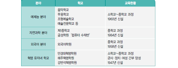 한편, 선발 기준에서 조금은 차이가 있지만 북한에서도 특수교육이 실시되고 있습니다. 고위층 자녀와 같은 특수한 신분이나 특수한 자질이 있는 학생들이 그 대상입니다. 특수 교육 기관으로 수재 양성을 위한 제 1중학교, 평양외국어학원, 만경대혁명학원을 대표로 들 수 있으며, 이 밖에도 금성학원, 평양음악학원, 남포중앙체육학원, 김정일예술학원 등 예체능계 학교가 있습니다. 이들 학교에서는 주로 무용, 음악, 조형예술, 교예 등에 소질이 있는 특기자들을 가르칩니다.