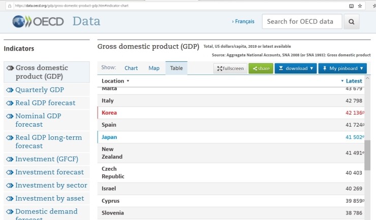 OECD 통계에서 한국의 1인당 GDP가 일본을 추월했다는 것이다. 그래서 원문을 찾아봤다.
