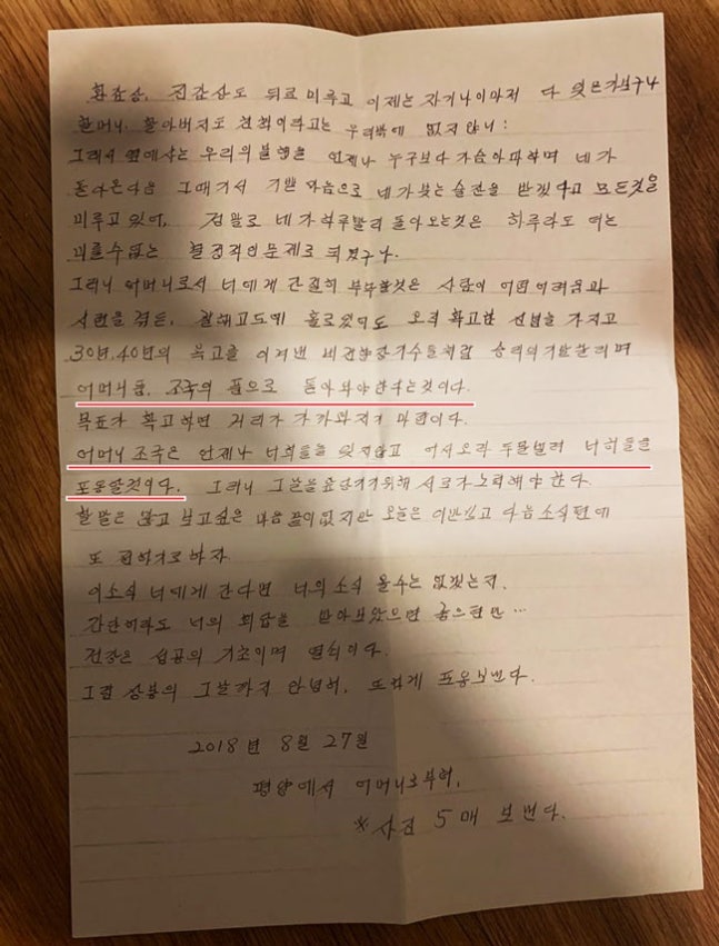 민변 강모 변호사가 탈북 여종업원들에게 직접 전달했다는 북에서 온 편지 중 하나. '어머니 우리당은 너희들의 송환을 하루빨리 실현하기 위해' '해외동포들과 세계량심적인 인사들이 너희들의 조속한 송환을 지지성원하고 있다' 등 북으로 돌아오라는 내용이 담겨있다. /허강일씨 제공
