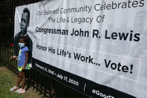 FacebookTwitterPinterest Kelli McLester poses in front of a poster outside of the South View Cemetery where John Lewis is being buried in a private ceremony on Thursday in Atlanta, Georgia. Photograph: Jessica McGowan/Getty Images