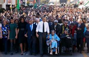 FacebookTwitterPinterest Barack Obama, center, walks as he holds hands with Amelia Boynton Robinson and John Lewis as they walk across the Edmund Pettus Bridge in Selma, Alabama, for the 50th anniversary of Bloody Sunday, in 2015. Photograph: Jacquelyn Martin/AP