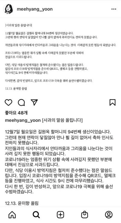 코로나19 확산세가 심각해지는 상황에서 방역당국이 “연말 연시 모임을 하지 말아달라”고 호소하는 가운데, 국회의원이 마스크를 쓰지 않은 채 식사모임을 하는 사진을 올리는 것은 부적절하다는 비판이 일었다. 윤 의원은 이에 사진을 삭제했다.삭제 후에도 논란이 계속되자 윤 의원은 자신의 SNS에 사과글을 다시 올렸다. 윤 의원은 “12월 7일 월요일은 길원옥 할머니의 94번째 생일이었다. 그런데 현재 연락이 닿질 않아 만나뵐 길이 없어서 축하인사도 전하지 못했다”며 “지인들과 식사자리에서 안타까움과 그리움을 나눈다는 것이 사려깊지 못한 행동이 되었다”고 밝혔다.