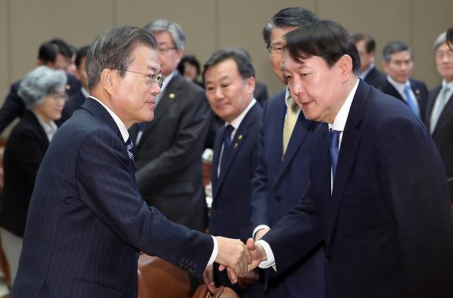 ▲ 문 대통령과 검찰총장 악수 문재인 대통령과 윤석열 검찰총장이 2019년 11월 8일 오후 청와대에서 열린 반부패정책협의회에서 인사하고 있다.
