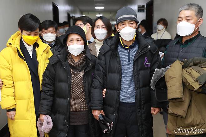 ▲ 고 김용균씨의 어머니 김미숙 김용균재단 이사장과 고 이한빛 PD의 아버지 이용관씨가 8일 오전 서울 여의도 국회에서 열린 법사위 전체회의에서 5인 미만 사업장이 대상에서 빠진 중대재해에 대한 기업 및 책임자 처벌 등에 관한 법률안이 통과된 후 회의실을 나서고 있다.