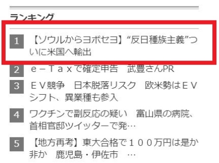 현재(21일 오후) 이 칼럼은 산케이 인터넷 홈페이지 초기화면 오른쪽 ‘랭킹’(순위) 리스트의 1위에 올라있다. 랭킹의 기준은 공개돼 있지 않으나 일반적인 경우에 비춰볼 때 독자들의 기사 조회 수일 가능성이 높다.