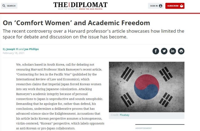 [디플로맷 홈페이지 갈무리](서울=연합뉴스) 신유리 기자 = '위안부는 매춘부'라는 망언으로 논란을 빚은 마크 램지어 하버드대 교수의 주장에 대해 연세대·한양대 교수가 사실상 '옹호'하는 듯한 기고문을 미 언론에 게재해 파문이 예상된다.
