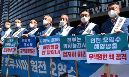 원본보기14일 오후 수협중앙회와 한국수산업경영인중앙연합회, 한국여성어업인연합회 등 수산단체 관계자들이 일본의 후쿠시마 제1원자력발전소에서 나오는 오염수의 해양 방류 결정에 반발하며 서울 종로구 주한일본대사관을 항의 방문, 규탄 성명을 발표하고 있다./오승현 기자 2021.04.14