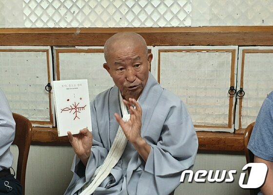 지리산 실상사 회주이자 인드라망생명공동체 상임대표인 도법 스님이 6일 오전 서울 종로구 한 식당에서 열린 책 '붓다, 중도로 살다' 출간 기자간담회에서 책 소개를 하고 있다. 2020.07.06/뉴스1 © News1 이기림 기자